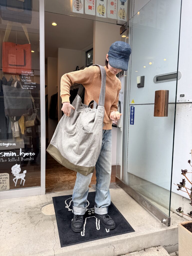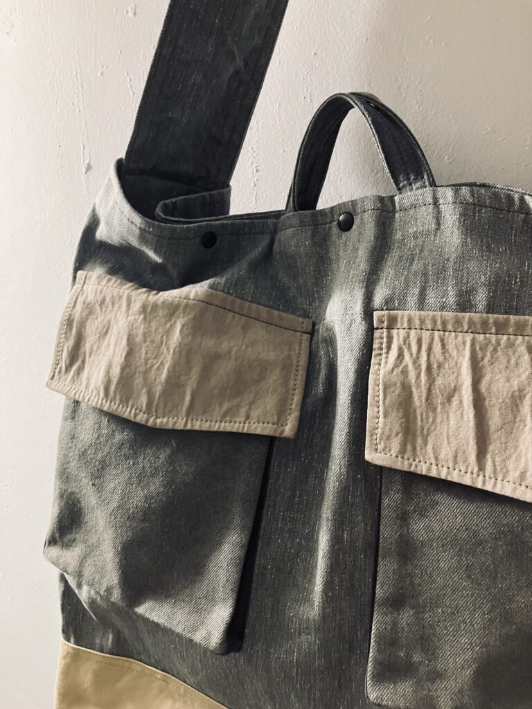 We’ve just received this oversized tote made from smoky khaki selvedge fabric. It’s perfect for carrying heavy loads thanks to its extra-large size. Come and try it on in-store!
